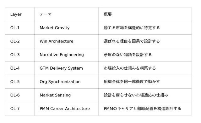 当社調べ(2026年3月30日時点)。「PMM実務の全工程(市場分析・戦略設計・GTM・組織連携・市場適応・キャリア設計)を因果接続した7レイヤー体系として独自設計し、商業的研修プログラムおよびフレームワーク単体ライセンスとして提供する形態」における国内初の取り組みとして。なお、既存の類似サービスとの差別化根拠として、当社が把握する限り、PMM特化型、PMM実務全体を体系化した7レイヤー構造の専門研修プログラムとしての商業提供は国内で前例がないことを確認しています。