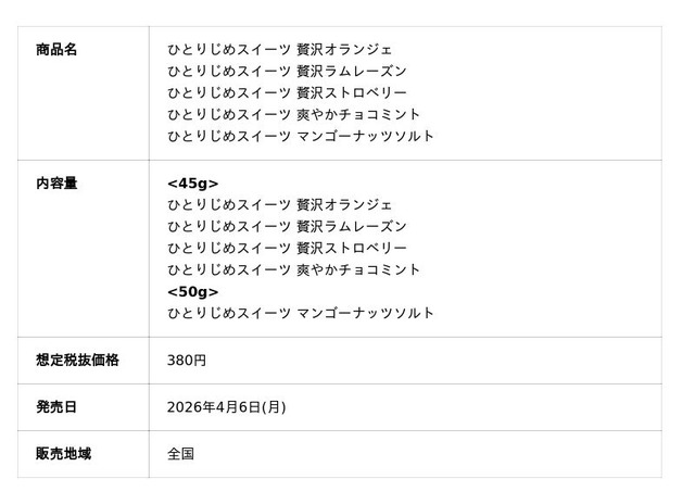 2025年に好評を博した「ひとりじめスイーツ 爽やかチョコミント」を再販するほか、夏の味覚として注目される塩やトロピカル素材を取り入れた新商品「ひとりじめスイーツ マンゴーナッツソルト」を発売いたします。