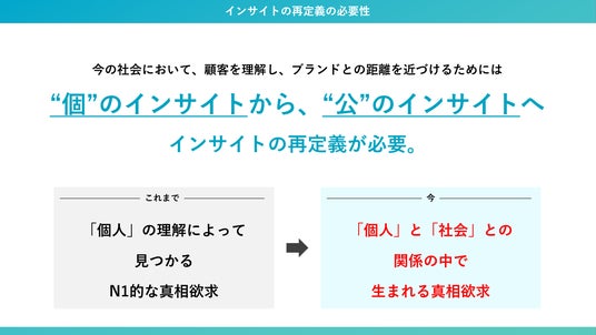 こうした「個」と「企業」が抱える共通の課題を解決するため、インサイトの再定義が必要と考えました。そこで、個人の声を社会全体の文脈で捉え直し、未来の価値をデザインする新フレームワーク「パブリックインサイト」の共同開発に至りました。