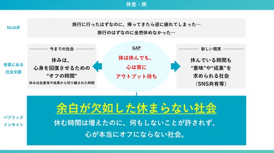 SNSの普及などにより、休んでいる時間にも“意味”や“成果”が求められる社会へと変容している。