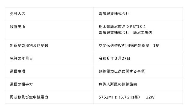 電気興業株式会社(本社:東京都江東区、代表取締役社長:近藤忠登史、以下「当社」)は、栃木県鹿沼市の鹿沼工場内に設置する5.7GHz帯空間伝送型ワイヤレス電力伝送システム用無線局について、総務省関東総合通信局より無線局免許を取得しました。今回の免許取得は、5.7GHz帯の空間伝送型ワイヤレス電力伝送システム用無線局として国内初となるものです。