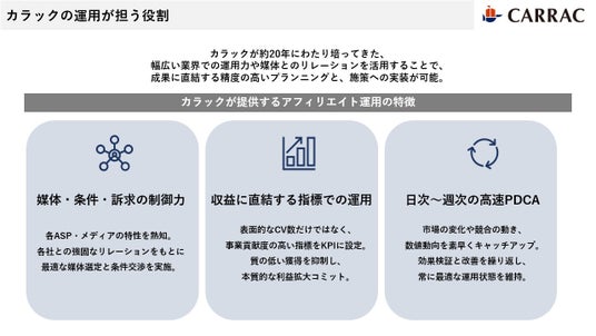 カラックは約20年にわたり、幅広い業界でアフィリエイト運用を支援してきました。・媒体・条件・訴求の制御力