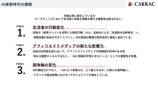 カラックは今後も、AI検索時代に適応したアフィリエイト戦略の高度化や価値ある意志決定シーンの創出を通じて、クライアント企業の持続的な事業成長に貢献してまいります。