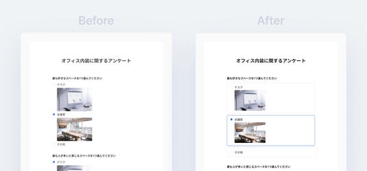 フォーム内の単一選択(ラジオボタン)および複数選択(チェックボックス)のUIデザインを、従来のテキストのみのデザインからカード型へと刷新しました。選択肢がカード形式で表示されることで、それぞれの選択肢の視認性が向上すると同時に、選択・未選択の判別もしやすくなり、回答者にとってよりスムーズな操作が可能になりました。また、画像付きの選択肢とテキストのみの選択肢が混ざっている質問項目も見やすくなりました。商品やデザインに関わるアンケートなど、回答者に視覚的な情報を伝えたいシーンで、より分かりやすいフォームを作成できます。