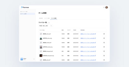 Formeeでは、フォームの回答時に画像やPDF、音声ファイルなど、さまざまな形式のファイルを添付できます。今回のアップデートでは、フォームへの回答に添付されたファイルを一覧で確認できる機能を追加しました。今回追加されたファイル一覧画面では、添付されたファイルをソートして素早く目的のファイルを見つけたり、不要になったファイルを削除したりすることが可能です。採用応募の履歴書や、社内申請の添付資料など、回答に添付されたファイルをまとめて管理することができます。