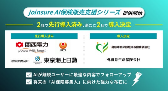 テクノロジーで顧客本位の業務運営を進化させるjustInCaseTechnologies(代表取締役:畑 加寿也、以下「当社」)は、生成AIを活用し、保険申込プロセスの離脱者を解析・フォローアップする「joinsure AI保険販売支援シリーズ」を開発しました(特許出願中)。本サービスは、当社が目指す「AI保険募集人」の実現に向けた現実的かつ強力な基盤となります。