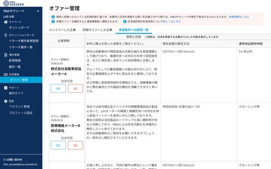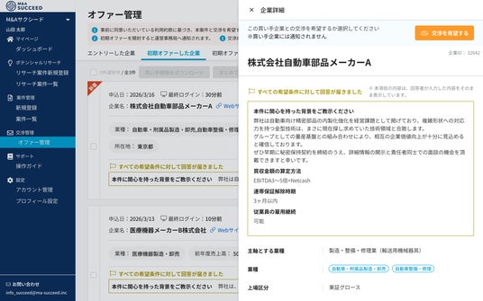 Visionalグループの株式会社M&Aサクシード(所在地:東京都渋谷区/代表取締役社長:金 蓮実)が運営する法人限定M&Aプラットフォーム「M&Aサクシード」(https://ma-succeed.jp/)は、譲渡を検討中のオーナー経営者が、自社の匿名情報とともに初期段階で知りたい具体的な条件や意向をあらかじめ設定し、譲受候補企業(買い手)から初期段階で収集できる「M&A初期オファー受付機能」の提供を開始しました。