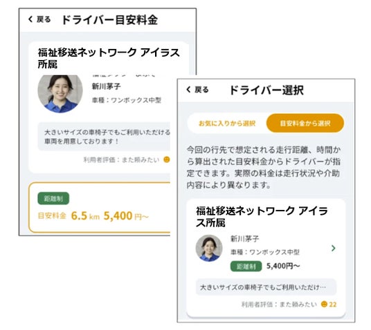 『よぶぞー』は、介護タクシーの予約時に対応可能なドライバーを一覧表示し、希望ドライバーの選択をすることができます。今回の協業により、アイラスの加盟事業者は、ひと目で判別できるよう表記されます。