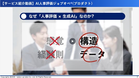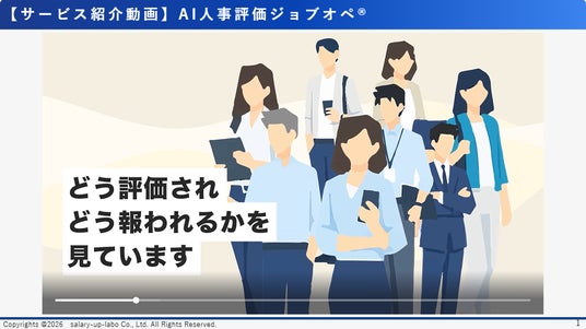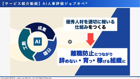 株式会社給与アップ研究所(本社:東京都渋谷区、代表取締役:高橋 恭介)は、AIを活用した人事評価制度構築支援サービス「AI人事評価ジョブオペ(R)」のサービス紹介動画を公開しました。