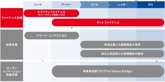 こうした背景を踏まえ、当行グループはネットワークを最大限に活用し、地域内外の事業会社、スタートアップ、地方公共団体、大学・研究機関など多様なステークホルダーと連携した「協創とイノベーション」活動を推進しています。本ページでは「ファイナンス支援」、「成長支援」、「オープンイノベーション取組支援」の三つの柱を軸とした包括的な支援体制※1について紹介しています。