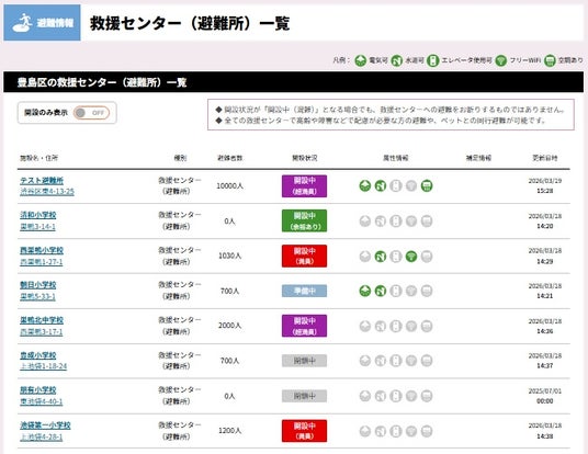 - 救援センター(避難所)や一時滞在施設、緊急医療救護所等の開設状況や受入可否、混雑状況等を一覧とマップで公開
