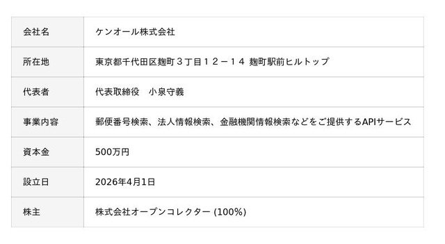 株式会社オープンコレクター (本社:東京都千代田区、以下「当社」) は、2026年4月1日付で、当社100%出資の子会社として「ケンオール株式会社」(本社:東京都千代田区、以下「新会社」) を設立しました。また、2026年7月1日に新会社へケンオール事業の移管を実施いたします。