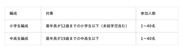 第8回大会では「部門」を廃止し、1人からでも参加できる大会になりました。審査は「編成」ごとに行い、チーム内の最年長メンバーの学年を基準に、いずれかの編成に分類されます。