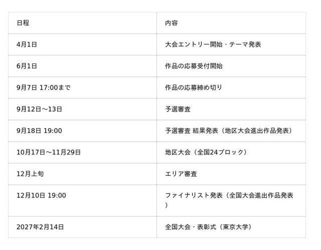 2026年度は「みんなが輝く!β世代の未来のまち~人口・年齢のバランスが変わる社会をどう生きる?~」をテーマに、全国24地区ブロック(国内23+海外1)で作品を募集します。今年度は部門制を廃止し、1人から応募できます。作品の応募締め切りは、9月7日 17:00まで。予選審査・地区大会・エリア審査を経て、2027年2月14日「東京大学」にて全国大会・表彰式を開催します。