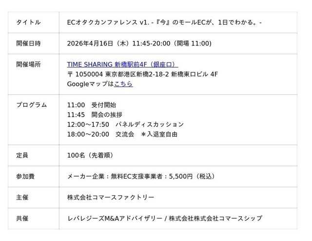 株式会社コマースシップ(代表取締役社長:上野護)は、2026年4月16日(木)に東京都内で開催される「ECオタクカンファレンス v1. -『今』のモールECが、1日でわかる。-」に共催として参加することをお知らせいたします。