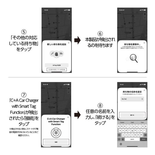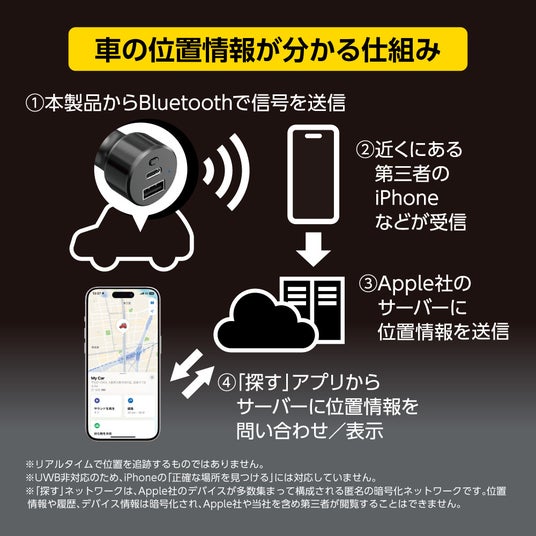本製品は、車載用USB充電器としての実用性と、車両位置を確認できるスマートタグ機能を1台に集約。