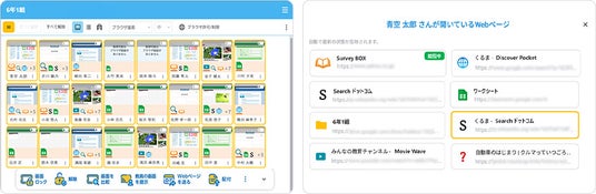 《授業中》クラス全体や個々のアクセス状況をリアルタイムで把握子どもたちが今どんなWebサイトにアクセスしているか、アイコン表示でひと目で確認できます。また、一人ひとりが開いているすべてのWebページの詳細の確認も可能です。その中から共有したいWebページを選んでほかの子どもたちに転送することもできます。