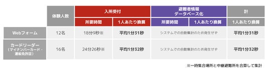 茨城県大洗町と実施した実証により、Webフォーム、カードリーダー(マイナンバーカード・運転免許証)ともに、受付に要する所要時間は、1人あたりおよそ平均1分30分という結果となりました。