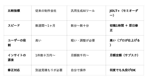 従来の制作会社に依頼する「品質(安心感)」と、AIツールによる「スピード(即時性)」。JOLT+はその両方のメリットを兼ね備えた、全く新しい制作スタイルを提示します。