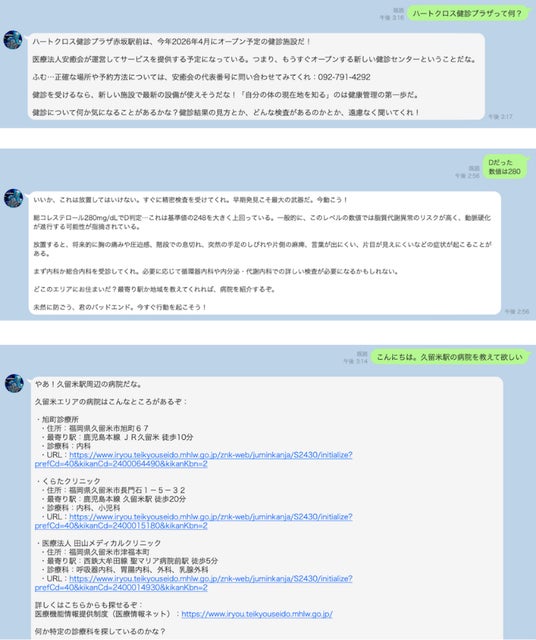 健診で異常値が出ても放置してしまう受診者に対し、リスクを分かりやすく伝え、次の行動へと導く伴走型AIサービスです。薬剤戦師「オーガマン」が24時間いつでも相談に対応し、LINE上で健診結果の解説、生活改善アドバイス、精密検査受診リマインドなどを提供。健診後の継続的な健康管理を支援します。