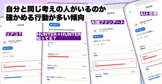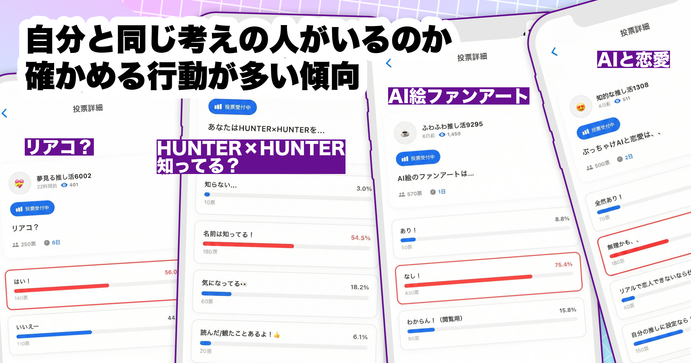 投票機能では、「自分と同じ考えの人がいるのか、他にどんな考えの人がいるのか」を確かめる利用が多く見られました。特に、推しにリアコ(リアルに恋をしてしまった)な推し活ユーザーが、「こんな気持ちになっているのは私だけなのかな?」という疑問を解消する場として活用されています。