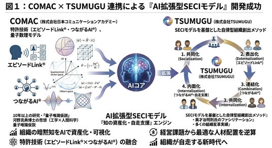 株式会社日本コミュニケーションアカデミー(本社:東京都豊島区、代表取締役:河野克典、以下「COMAC」)と、株式会社TSUMUGU(本社:東京都港区、代表取締役:美才治明則、以下「TSUMUGU」)は、知識創造理論「SECIモデル」をAIで拡張した新たな組織開発手法「AI拡張型SECIモデル」を共同開発しサービス提供を開始したことをお知らせいたします。