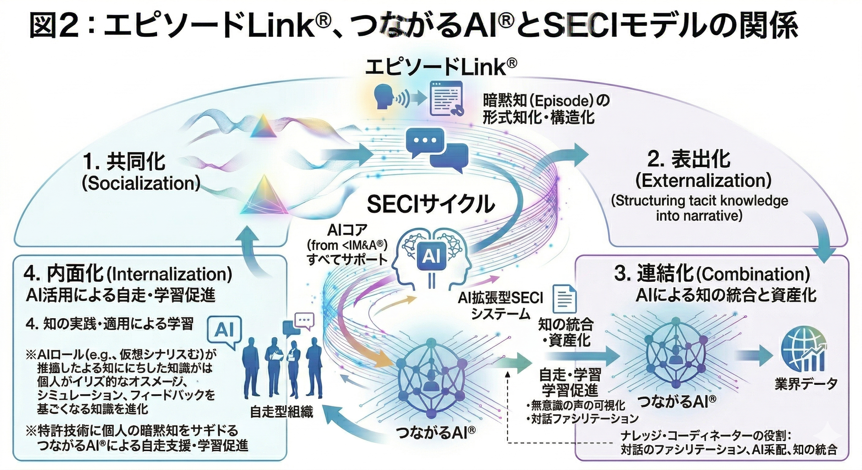 野中郁次郎氏が提唱した知識創造理論「SECIモデル」に、COMACが保有する特許技術「エピソード link(R)」および「つながる AI(R)」を統合することで、組織知の生成を飛躍的に加速させるイノベーションを実現しました。