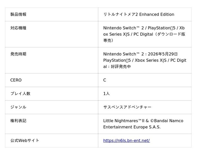 株式会社バンダイナムコエンターテインメントは、サスペンスアドベンチャーゲーム『リトルナイトメア2 Enhanced Edition』につきまして、ダウンロード版専売でNintendo Switch(TM) 2にて2026年5月29日(金)に発売することを発表いたしました。オリジナル版から強化したグラフィックと立体音響でゲームプレイをお楽しみいただけます。