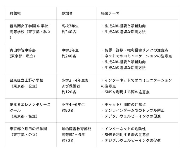 今回は2025年6月から2026年2月にかけて、有限責任 あずさ監査法人(本部:東京都新宿区)、株式会社KPMG FAS(本社:東京都千代田区)、株式会社KPMG Forensic & Risk Advisory(本社:東京都千代田区)のサイバーセキュリティに関するプロフェッショナルとともに、主にインターネットに潜む犯罪や詐欺、SNSを含むインターネット上のコミュニケーション、生成AIを活用する際の注意点などをテーマにした特別授業を、東京都内の小中高校計5校にて実施しました。期間中は、延べ760名を超える小中高校生および保護者が参加しました。