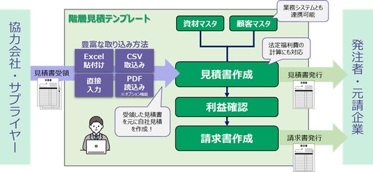 「建設業 階層見積作成モデル」は、SCSK株式会社が提供する「CELF」を活用します。「CELF」はExcelに近い操作性を持ちながら、ノーコードで業務アプリケーションを構築できることが特徴です。本モデルでは、「CELF」で階層見積を作成できるアプリケーションを、テンプレートで提供します。また、協力会社から受け取った、CSVなどさまざまな形式の見積書を取り込んで、階層見積書の作成に活用することも可能です。階層見積書を作成した経験が浅い人でも、効率的に階層見積書を作成でき、建設業における見積作成業務の標準化を実現します。また、利益確認や請求書作成などのアプリケーションをテンプレートとして提供し、請求書業務を効率化するクラウドサービス「MakeLeaps」や、基幹システム等の他システムとの連携も可能で、見積に関連する周辺業務の効率化にも貢献します。