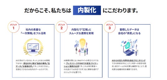 しかし、こうした情報を正確に言語化し、AI向けに最適な形式で発信できるのは、外部の代理店ではなく、社内チームだけです。本プログラムは、このような一次情報の発掘・構造化・発信を社内で継続的に実施できる人材と体制の育成を支援します。