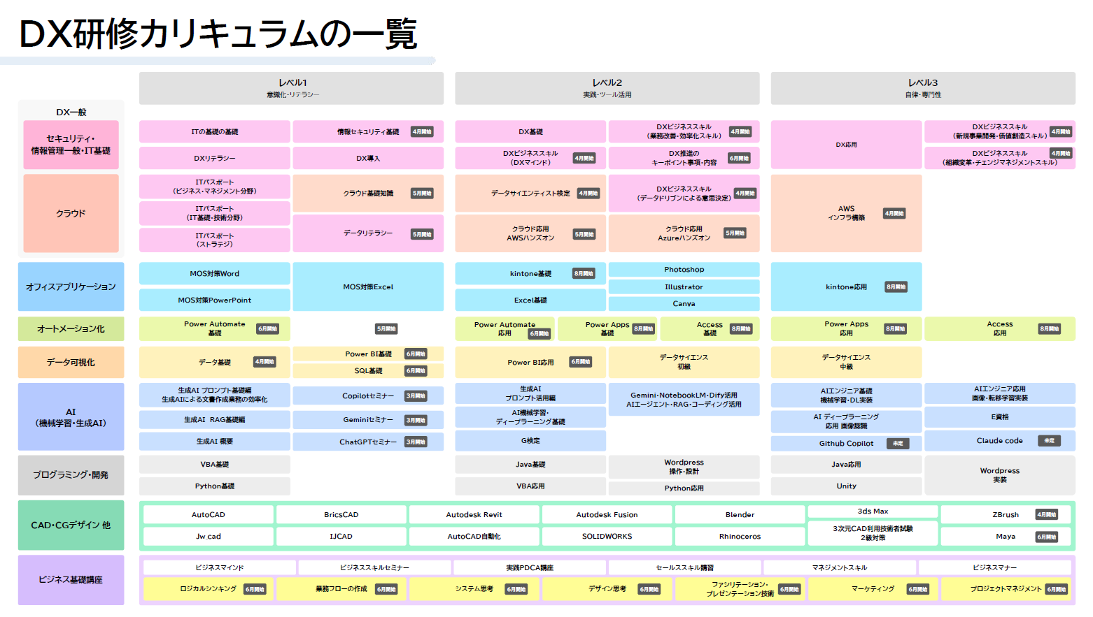ビジネス基礎コンテンツ・DX一般技術コンテンツ・CAD・AIプログラミング・CGモデリング・Officeなどの幅広いテックスキルを学べます。コンテンツの内容は随時更新されます。詳しくはこちら