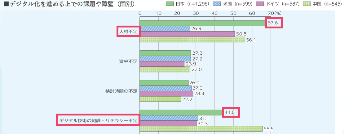 企業のデジタル化・DX推進が進む一方で、多くの企業は「人材不足」を最大の障壁として抱えています。総務省の「令和4年版 情報通信白書」によると、デジタル化推進における最大の課題は「人材不足(67.6%)」であり、加えて「知識・リテラシー不足(44.8%)」が大きなボトルネックとなっています。