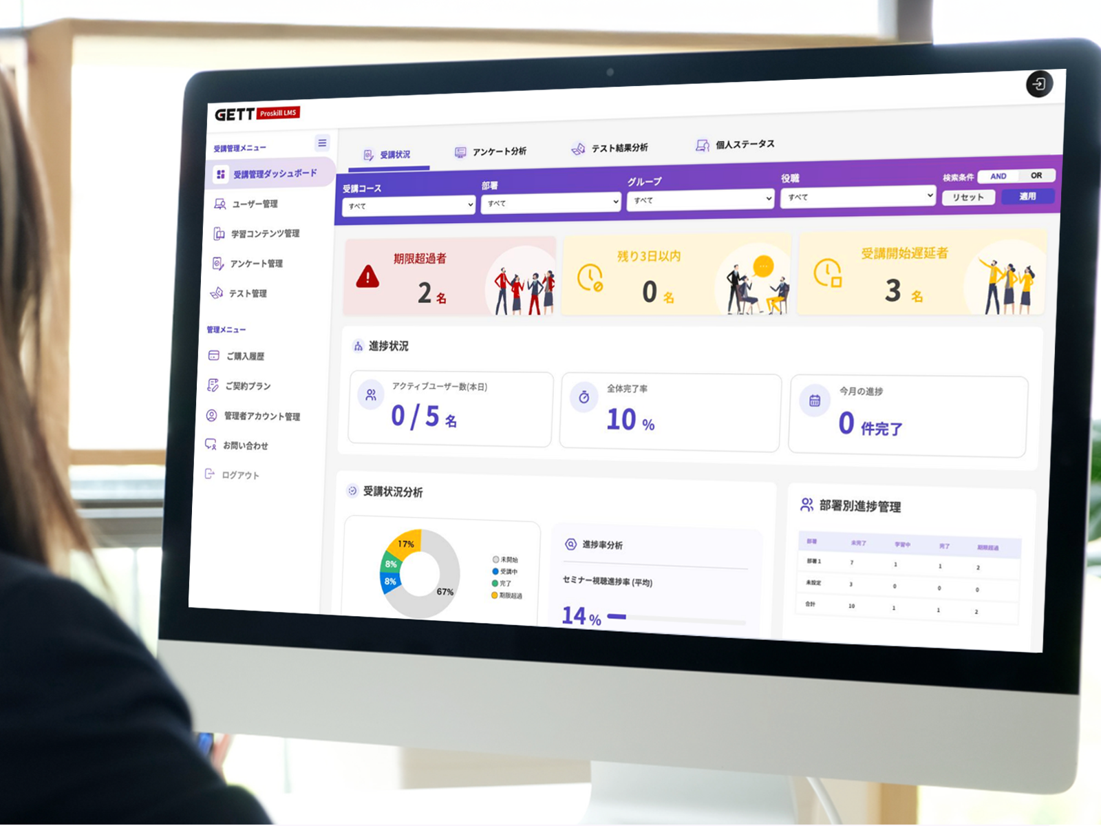 教育管理システム「GETT Proskill LMS」により、進捗や学習履歴を可視化し、教材管理も一元化できます。管理・学習の双方を効率化します。