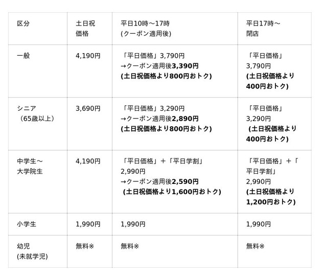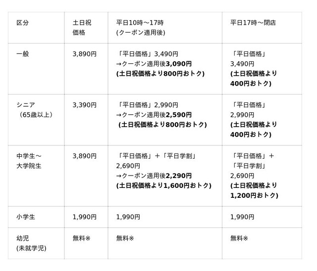 ※1「平日学割」は学生証ご提示の本人に限り有効です。「平日価格」・「平日学割」はキャンペーン開催期間中の土日・祝を除く平日のみが割引適用となります。「平日価格」の対象は一般・シニア料金のお客様です。