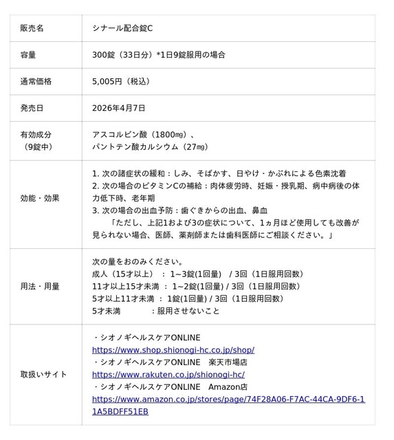 そのシナールから、医療用と同成分・同量配合*のシナール配合錠C(第3類医薬品)をオンライン限定で新発売。しみ・そばかすなど色素沈着対策や疲労時などのビタミンC補給に。オンラインでいつでも購入可能となります。