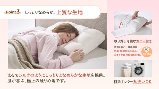 近年、睡眠の質向上を目的としたスリープテック市場は世界的に拡大を続けており、日本でも「令和の眠活」としてデバイスやサプリ、寝具の見直しに取り組む生活者が増えています。一方で、テクノロジーに頼る前に"寝具そのもの"を最適化したいというニーズも根強く、なかでも枕は最も身近でありながら最も悩みが尽きないアイテムです。実際、自分に合う枕が見つからず買い替えを繰り返す"枕難民"は約9割にのぼるというデータもあり(※)、枕選びの難しさは多くの人に共通する課題となっています。「アプリやガジェットで睡眠データを"見える化"する時代だからこそ、頭を預ける枕の物理的な心地よさは一層重要になる。"枕難民"が買い替えを繰り返さなくて済む一本をつくりたい」という開発担当者の信念が、本製品の出発点でした。0.3デニールの極細繊維による"ふにゅとろ"の感触、独立キルト構造によるフィット性、そして丸洗いできる衛生設計。テクノロジーでは補えない"触れた瞬間の心地よさ"を徹底的に追求し、毎日の眠りの土台をアップデートする一本に仕上げました。※自社調べ(2026年3月実施、出典:https://prtimes.jp/main/html/rd/p/000000321.000036491.html)