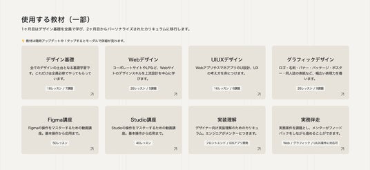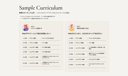 - 1ヶ月目のデザイン基礎は全員必修フォント・色・形・余白など、すべてのデザインの土台を積み上げてから、2ヶ月目以降にパーソナライズされた学習へ移行
