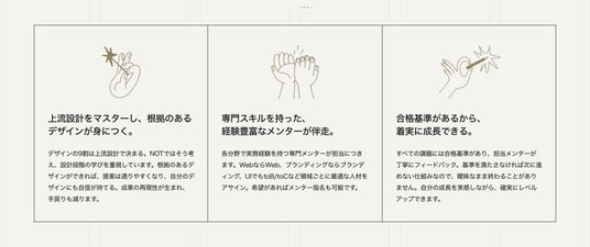 - 現役メンター担当制分野別(Web・UIUX・グラフィック・ブランディング・実装など)に適任メンターをアサイン。希望があればメンター指名も可能