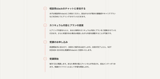 希望開始月に合わせて決済のご案内を送付。決済完了後、NOT DESIGN SCHOOL受講用のSlackに招待します。STEP5|毎月1日に受講開始