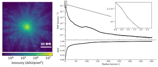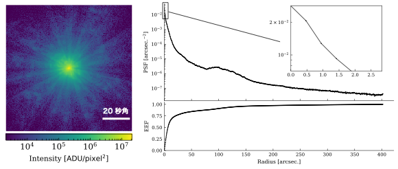 図4:X線望遠鏡によって得られた結像イメージ(左)と、その点像分布関数PSF(右上)および累積動径カウント関数EEF(右下)。本研究では、FWHM 0.7秒角、HPD 14秒角の高い解像度を達成した