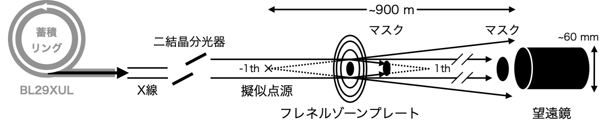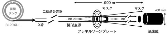 図3:SPring-8長尺ビームラインBL29XULに構築した高輝度無限遠点光源模擬評価システムHBX-KLAEESの概念図。フレネルゾーンプレートなどのX線光学素子を用いて仮想的な点光源を生成し、約1 kmの長距離伝搬により天体から到来するほぼ平行なX線を模擬する