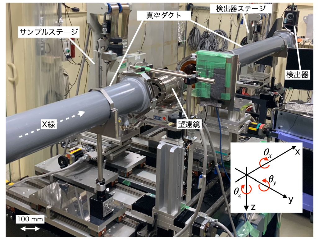SPring-8の約1 kmの長いビームラインBL29XULを利用して構築されたX線望遠鏡評価システム。宇宙の遠方天体から届くほぼ平行な硬X線を地上で再現し、望遠鏡の性能を高精度に測定できる。