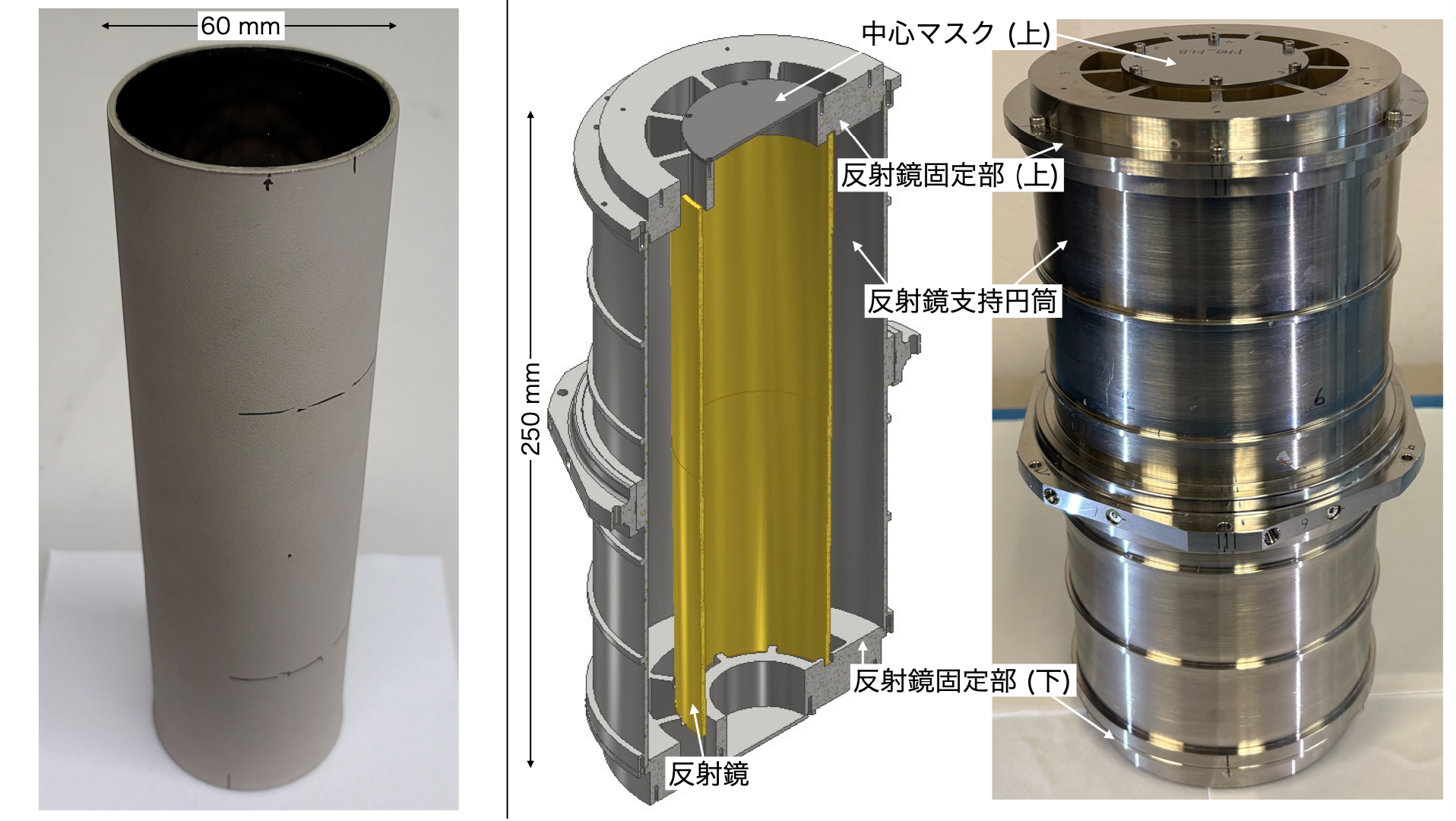 図1:本研究で開発したX線反射鏡(左)と、反射鏡を接着実装したX線望遠鏡の組み立て構造(中央)および完成した望遠鏡の外観写真(右)
