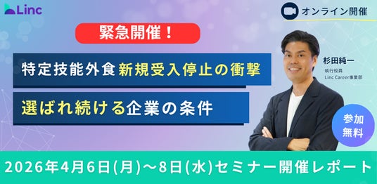 外国人材の「日本に来てよかった」を最大化させるプラットフォーム「Linc Global Hub(グロハブ)」を展開する株式会社Linc(本社:東京都千代田区、代表取締役CEO:仲 思遥、以下Linc)は、2026年4月6日から8日の3日間にわたり、緊急オンラインセミナー「外食業・特定技能『受入枠上限』到達 ─ 採用停止を回避し、持続可能な組織を創るための戦略」を開催いたしました。本セミナーには、国内の主要な外食チェーン、サービス業を展開する著名企業の人事・人材開発担当者が多数参加し、上限到達という異例の事態に対する関心の高さが浮き彫りとなりました。