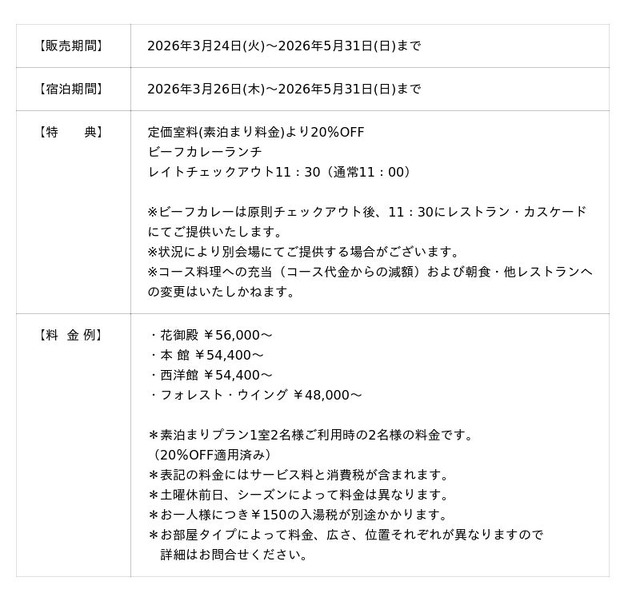 富士屋ホテルは、2020年7月15日に“平成の大改修”を経てリニューアルオープンし、2025年に5周年の節目を迎えました。このたびの記念にあわせ、箱根に芽吹く春の気配を感じていただける期間限定の宿泊プランをご用意いたしました。本プランでは、本館・西洋館・花御殿・フォレスト・ウイングの全客室を対象に、定価室料(素泊まり料金)より20%OFFにてご案内いたします。さらに特典として、富士屋ホテル伝統の味わいであるビーフカレーをお楽しみいただけます。