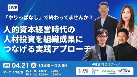 医療機関向け遠隔医療通訳や企業の健康経営(R)支援を行うメディフォン株式会社(東京都港区、代表取締役CEO:澤田真弓、以下「メディフォン」)は、株式会社スピークバディ(以下「スピークバディ」)主催のもと、2026年4月21日(火)に開催される、人的資本経営時代の人材投資を組織成果につなげる実践アプローチをテーマとした合同ウェビナーに登壇いたします。