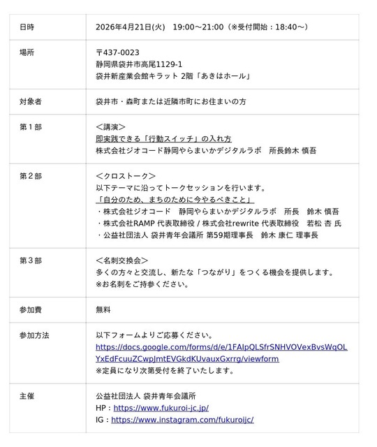 袋井青年会議所主催「発見!繋がる!!異業種交流」の講演・クロストークにジオコードの静岡やらまいかデジタルラボ所長・鈴木慎吾が登壇 - PR TIMES|RBB TODAY