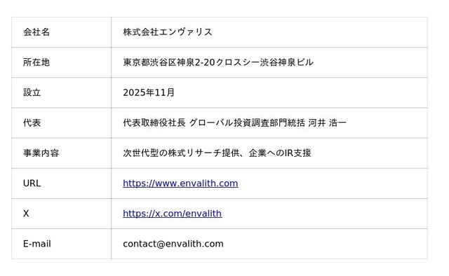 次世代型の株式リサーチ・プラットフォームを展開する株式会社エンヴァリス(本社:東京都渋谷区、代表取締役社長:河井 浩一、以下「当社」)は、株式会社トリプルアイズ(本社:東京都港区、代表取締役:山田 雄一郎、証券コード:5026)の2026年8月期 第2四半期 決算プレビューレポートを本日配信いたしました。