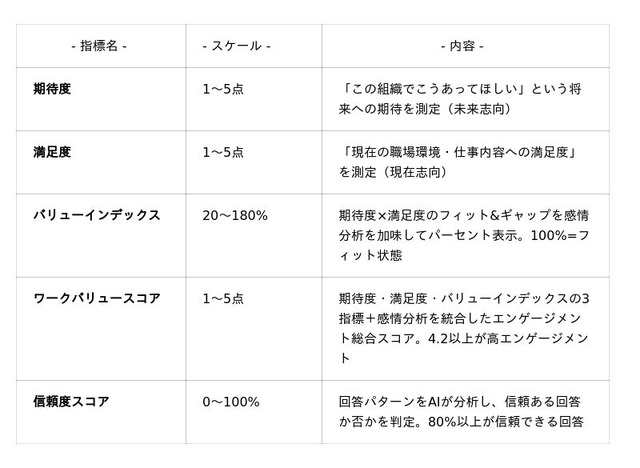 本特許技術の核心は、単純な平均スコアにとどまらず、「期待度(未来志向)」と「満足度(現在志向)」のギャップをパーセント表示する独自指標「バリューインデックス」と、自由記述の感情分析を加味した「ワークバリュースコア」を組み合わせて算出するスコアリングエンジンです。さらに、適切な回答(短時間・パターン回答)を検出する「信頼度スコア」により、データの質を担保します。